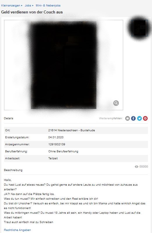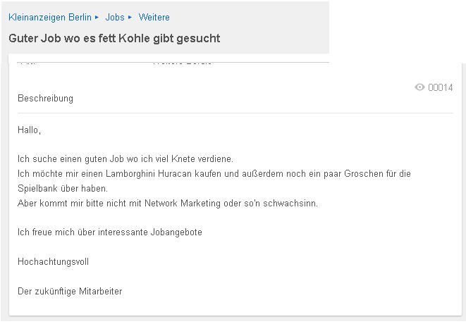 Diese Beispiele sollen lediglich der Veranschaulichung dienen, dass man bei dem “Job-Gesuche” oder generell bei Anzeigen sehr gut aufpassen sollte, was man genau sucht und auch natürlich darauf, was man anbieten möchte.
